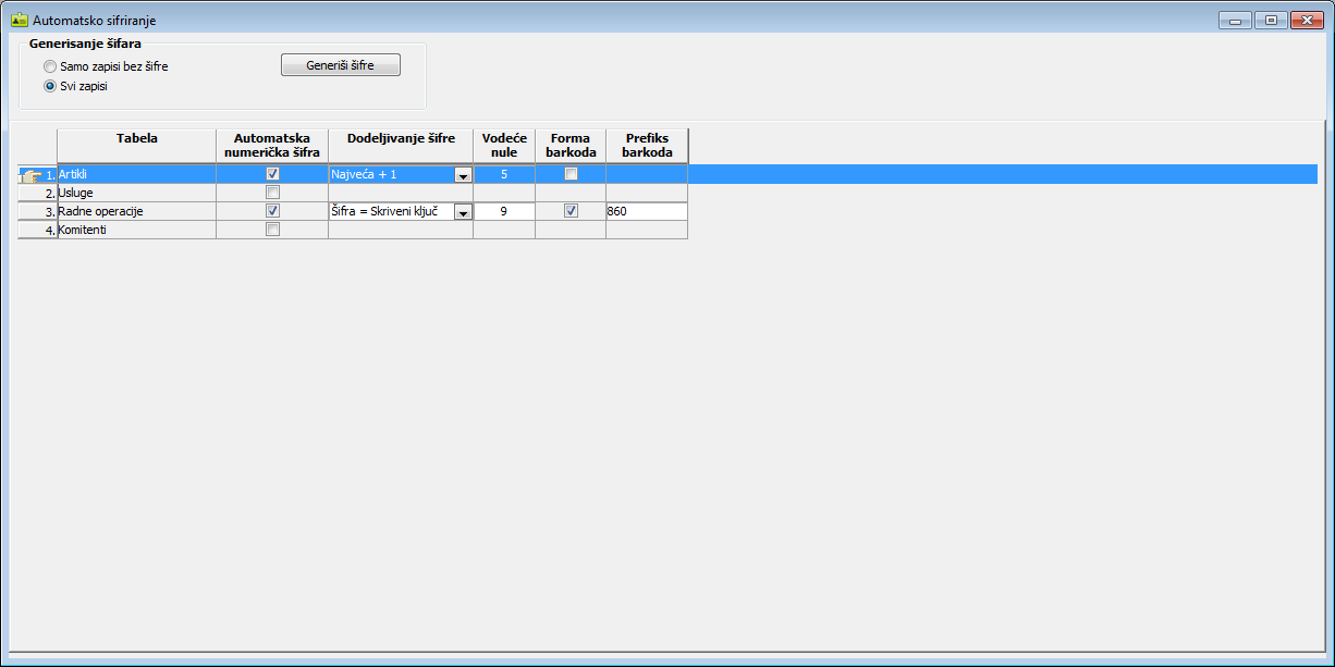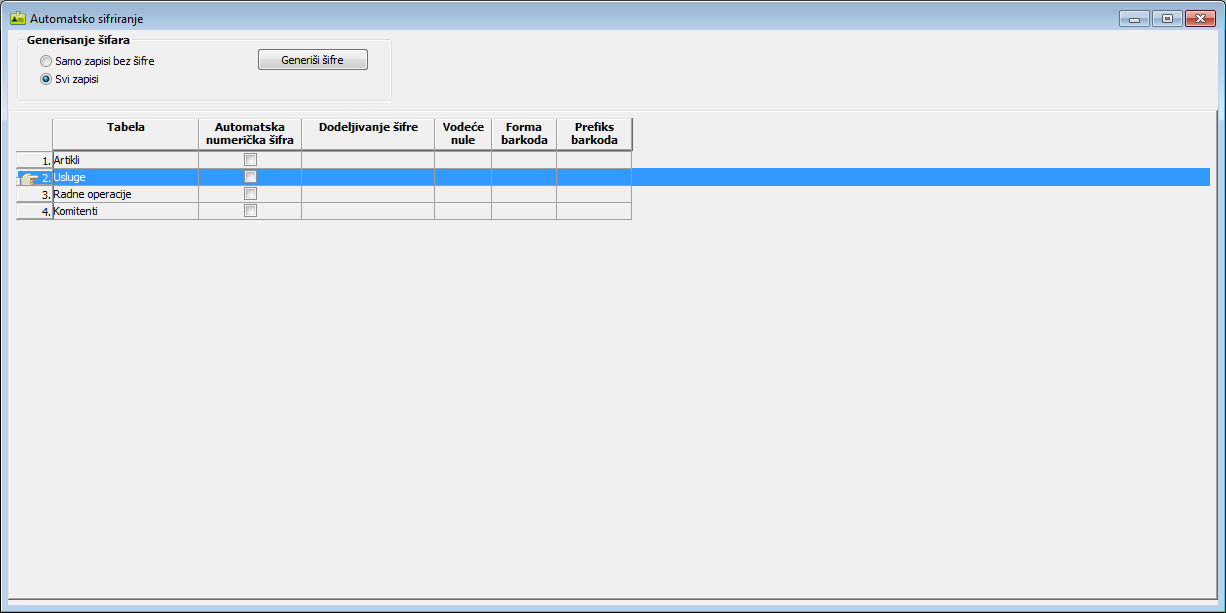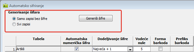 Selektujte red sa nazivom tabele nad kojom primenjujete proceduru automatskog šifriranja (npr. Artikli). U sekciji "Generisanje šifara"