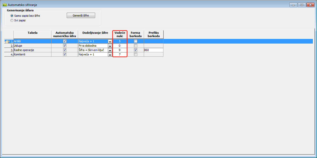 U kolonu "Vodeće nule" unosite broj koji određuje dužinu šifre (ukupan broj cifara od kojih je šifra sastavljena). Ukoliko generisana