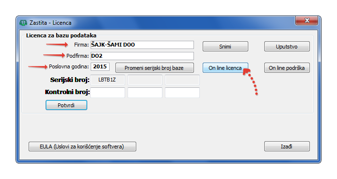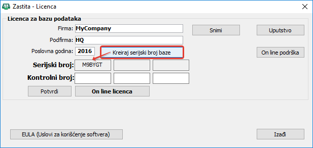 U polje za naziv baze treba uneti NAZIV FIRME čiji će se podaci obrađivati. Potvrdite unos podataka i dobićete kontrolni kod koji će automatski biti unet u odgovarajuća polja. Ukoliko se to iz nekog razloga ne dogodi treba prekucati ili jedno po jedno sa Copy-Paste preneti u istovetna polja kontrolnog broja aktivnog prozora Zaštita-Licenca. Uverite se da je kontrolni kod pravilno unet i kliknite na dugme "Potvrdi". Ukoliko je kontrolni kod ispravan, licenca je prihvaćena i dobićete poruku o datumu do kog je produžena. Kako ste novi korisnik, dobili ste privremenu licencu do 30 dana.