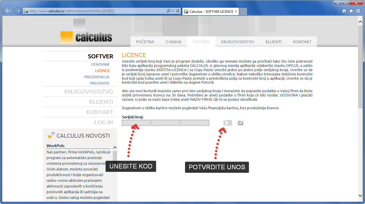 Registracija Vaše kopije Calculus 12 softvera i baze podataka nije moguća bez kreiranog serijskog broja.