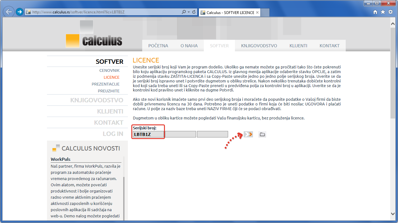 Označite poslednjih šest alfanumerika iz linka internet pregledača i sa Copy-Paste prenesite u prvo polje serijskog broja. Ove alfanumerike možete i prekucati u prvo polje serijskog broja. Potvrdite unos klikom na simbol strelice (vidi sliku)