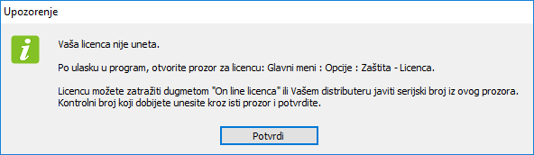 Obaveštenje da licenca nije uneta. znači da je uključena zaštita i da u programima više ne možete uneti nijedan novi dokument ili stavku. Ovo je jedino ograničenje. Možete menjati postojeće dokumente, ulaziti u sve prozore i pregledati podatke, ali novi unos je zabranjen.