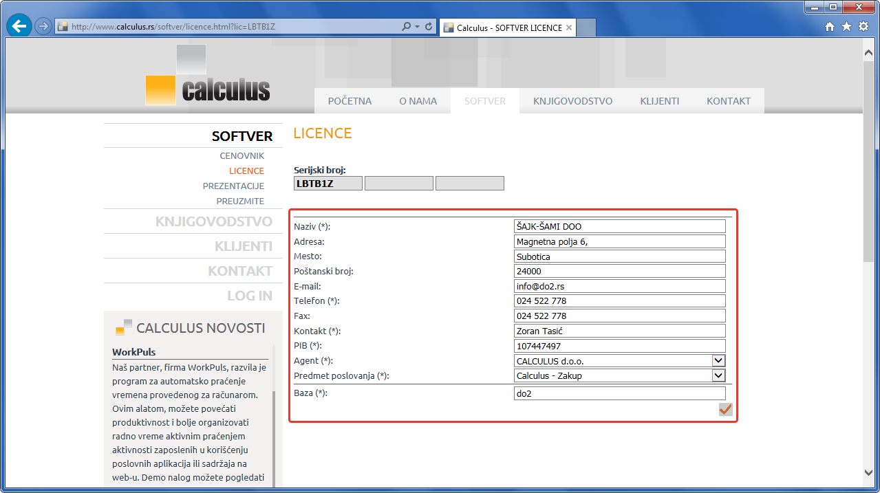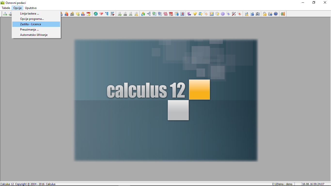 U zavisnosti da li ste postali Calculus 12 korisnik posredstvom Calculus zastupnika ili distributera ili ste Calculus 12 nabavili direktno od proizvođača, pozivate Help-Desk Vašeg prodavca ili tehničku podršku Calculusa. Kada telefonom uspostavite kontakt sa licem ovlašćenim za izdavanje licence, saopštite mu naziv firme i podfirme, poslovnu godinu baze i serijski broj prikazan u prozoru Zaštita-Licenca. Ove podatke možete sami promeniti i snimiti dugmetom "Snimi". Ta tri podatka nisu obavezna, ali služe za lakše raspoznavanje konkretne baze podataka.