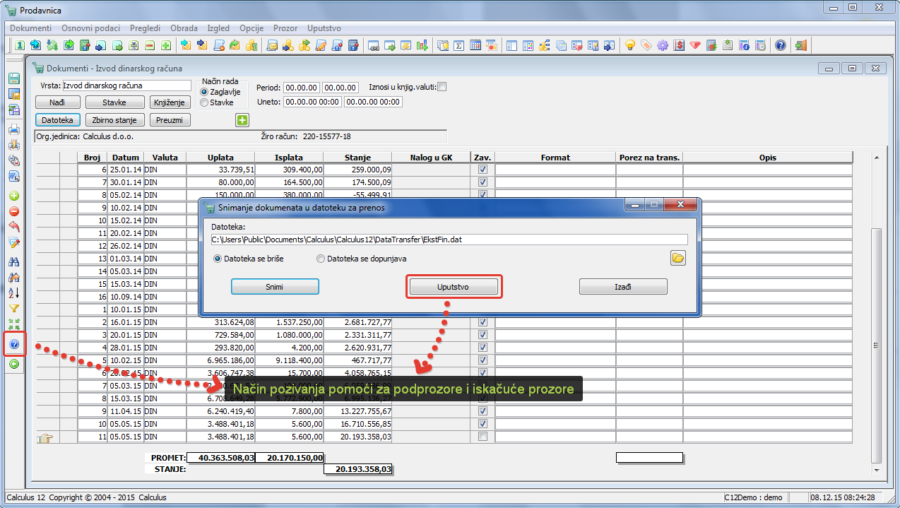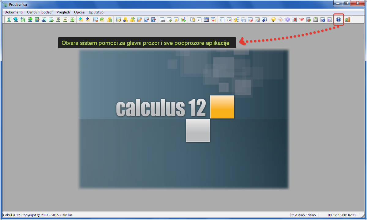 Pritisnite funkcijski taster F1 kako biste u toku rada dobili sveobuhvatna uputstva o korišćenju softvera ili u glavnom meniju svake Calculus 12 aplikacije odaberite stavku "Uputstvo > Uputstvo F1" ili klikom na ikonu u okviru osnovnog menija (linije tastera - toolbar) na dugme Uputstvo