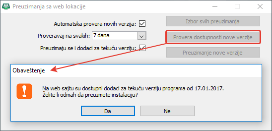 Postojanje novih nadogradnji i dodataka može se provetiti mimo automatske provere. U glavnom meniju kliknite na opciju "Opcije - Preuzimanja... da otvorite dijalog prozor "Preuzimanje sa web lokacije". Kliknite na dugme "Provera dostupnosti nove verzije" (vidi sliku)
