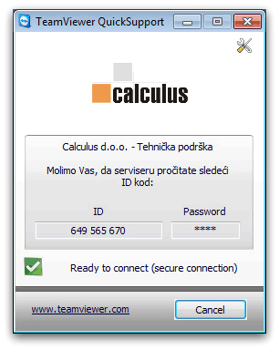 Calculus 12 podrška i servisna služba koriste savremeno sve-u-jednom rešenje za daljinski pristup i podršku korisnicima preko Interneta. Naši serviseri se povezuju na bilo koji PC ili server širom sveta u roku od samo nekoliko sekundi. Možemo daljinski upravljati procesima na Vašem računaru ili serveru kao da smo na mestu događaja. Naravno, uz Vašu asistenciju i dozvolu. Na ovaj način su Vam naši stručnjaci iz sektora za podršku korisnicima i održavanje, dostupni gotovo trenutno, a sa ciljem osiguravanja kontinuiteta rada Vašeg informacionog sistema bez narušavanja poslovnih procesa (vidi sliku)