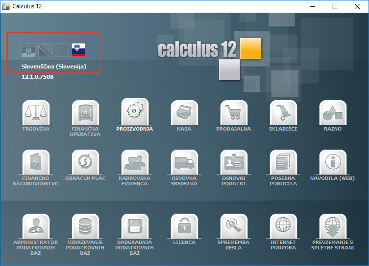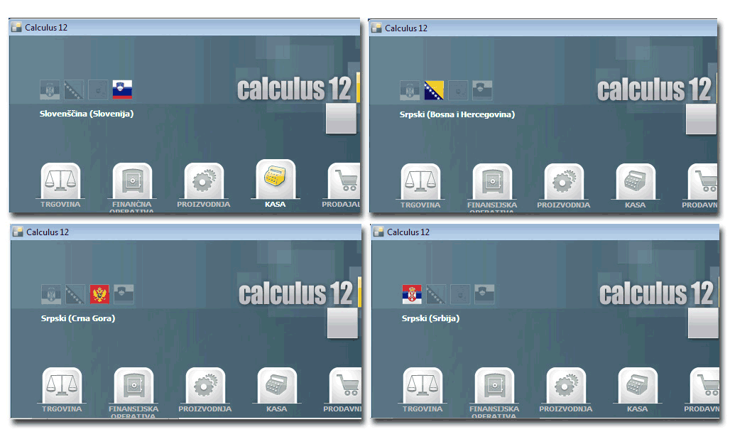 Calculus 12 poseduje višejezički korisnički interfejs. Izborom jezika automatski se prelazi na štampu obrazaca i zakonsku regulativu odabranog jezičkog područja (vidi sliku)