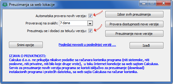 Pokrentanjem instalacionih fajlova CalculusSetup.exe, CalculusNadogradnja.exe i CalculusDodaci.exe postoji mogućnost provere da li na sajtu proizvođača softvera Calculus 12 postoji novija verzija. Ova provera je inicijalno isključena, ali se može uključiti po želji. Otvorite bilo koju aplikaciju Calculus 12 paketa. Iz glavnog menija izaberite Opcije->Preuzimanja... Čekirajte polja: