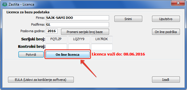 U prozoru "Zaštita - Licenca" dugmetom "On line licenca" omogućeno je automatsko produžavanje licence preko web servisa, bez prekucavanja kodova, ako korisnik zadovoljava uslove za produžavanje licence. Sva tri polja serijskog broja sadrže po 6 alfanumeričkih znakova. Potvrdite komandno dugme "On line licenca" (vidi sliku)