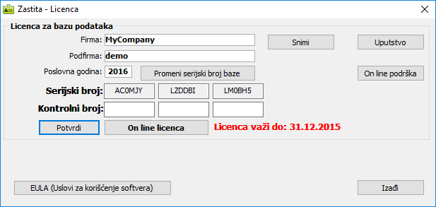 Licenca se dodeljuje na nivou jedne baze podataka, a ne na nivou programa. Dakle, ako imate više instaliranih baza, morate ući u program onoliko puta koliko imate baza i ponoviti ovaj postupak sa serijskim brojem.