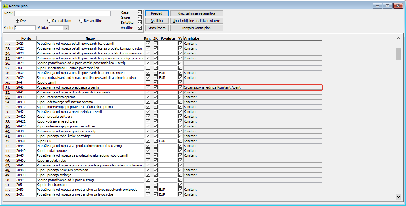 Prvo se uverite da li kontni plan sadrži sva konta koja se pojavljuju u vašem nalogu početnog stanja glavne knjige. Ukoliko vam ne odgovara neki naziv konta slobodno možete promeniti njegov naziv, obrisati nepotrebna ili dodati nova konta (vidi sliku)
