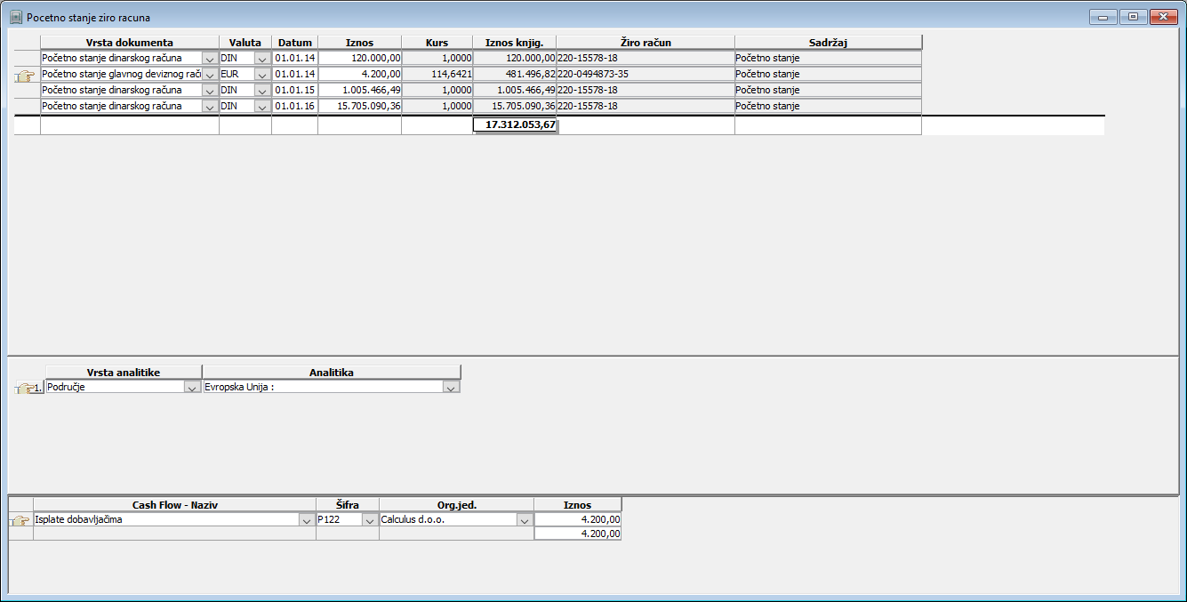 Početna stanja tekućih računa unosite odvojeno za svaki bankovni račun. Kako ste prilikom formiranja osnovnih podataka definisali sve vaše račune kod poslovnih banaka i dodelili im naloge početnih stanja i izvode, sada je veoma lako uneti za svaku banku ponaosob stanje sredstava na dan početka rada u Calculusu 12. Isto uradite i za devizne račune ukoliko ih imate.