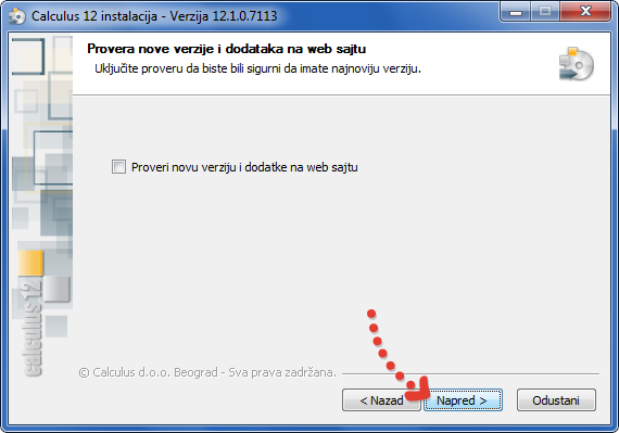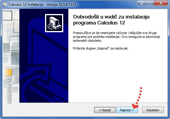 - Pritisnite dugme "Napred" za nastavak instalacije (vidi sliku)