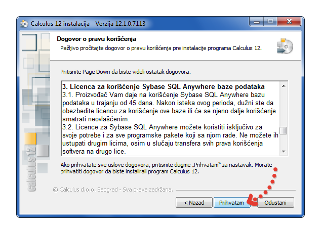 - Prilikom preuzimanja instalacionog fajla sa interneta, prikazuje se SAGLASNOST KORISNIKA O USLOVIMA KORIŠĆENJA SOFTVERA za krajnjeg korisnika (EULA). Uslove korišćenja treba pročitati i ukoliko prihvatate uslove dogovora, klikom na dugme Prihvatam, nastavite instalaciju. Tekst saglasnodti možete pročitati i ovde....