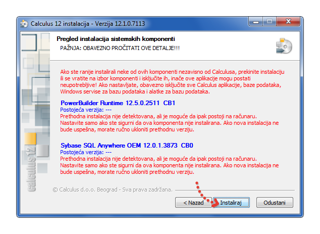 Instalacija uključuje sve module paketa, bazu podataka za korisnika i DEMO bazu sa podacima za upoznavanje sa radom paketa. Instaliraće se kompletan "Calculus 12" paket.