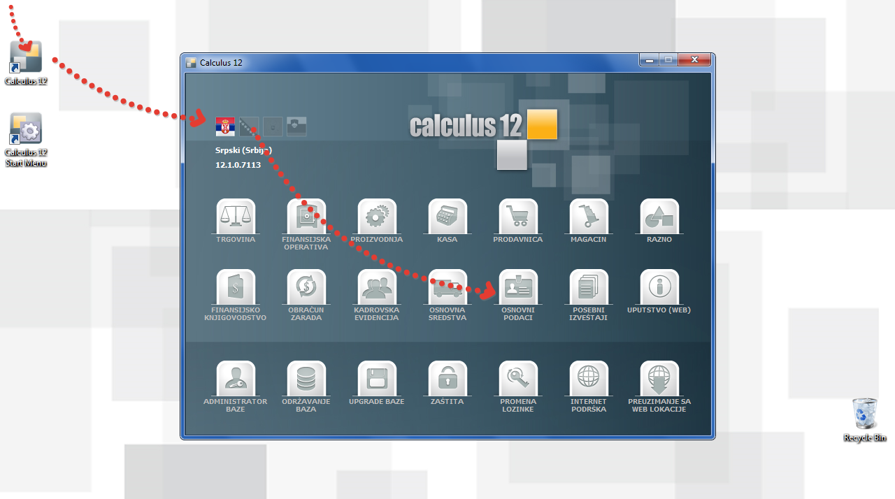 - Po završenom resetovanju računara pokrenite glavni aplikacioni meni dvoklikom na prečicu "Calculus 12", klikom na "Calculus 12" ikonu u Widows Start meniju ili izborom iz "Calculus 12" programske grupe u Widows Start meniju. (vidi sliku)