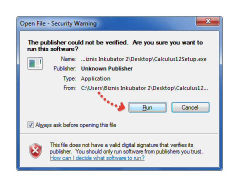 - Pokrenite instalaciju dvoklikom miša na fajl Calculus12Setup.exe zatim na dugme "Run".