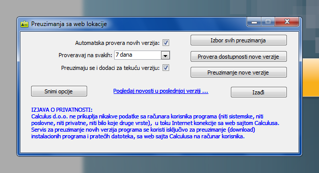 U prozoru "Preuzimanje sa Web lokacije" možete proveriti dostupnost nove verzije klikom na taster "Provera dostupnosti nove verzije". Klikom na taster "Preuzimanje nove verzije" pokrećete proceduru preuzimnja verzije za nadogradnju i dodatke. Možete samo preuzeti pa ih kasnije instalirati ili izvršiti istovremeno preuzimanje a zatim i instalaciju nadogradnje i dodataka.