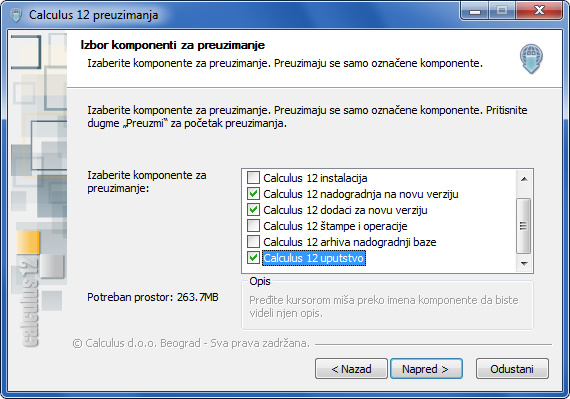 Dijalog prozor za definisanje parametara preuzimanja komponenti Calculusa 12..