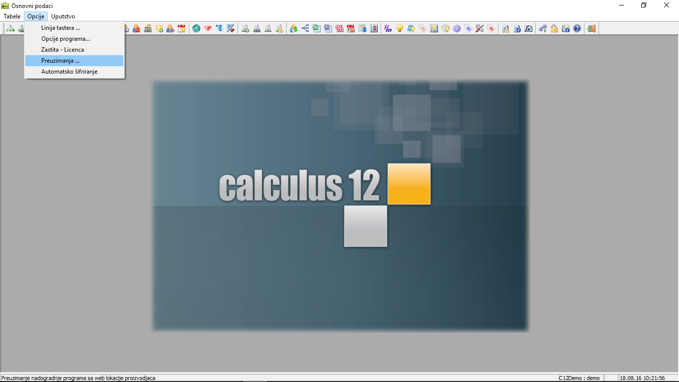 U glavnom meniju svih programa paketa "Calculus 12" odaberite stavku menija "Opcije > Preuzimanja..."