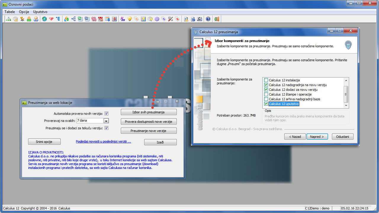 Sa Weba možete preuzeti sve komponente neophodne za instalaciju Calculus 12 paketa uključujući sistemske komponente, instalacioni fajl, nadogradnju, dodatke, specijalne štampe i operacije rađene po zahtevu korisnika Calculusa 12, arhive za nadogradnju baze i kompletno uputstvo