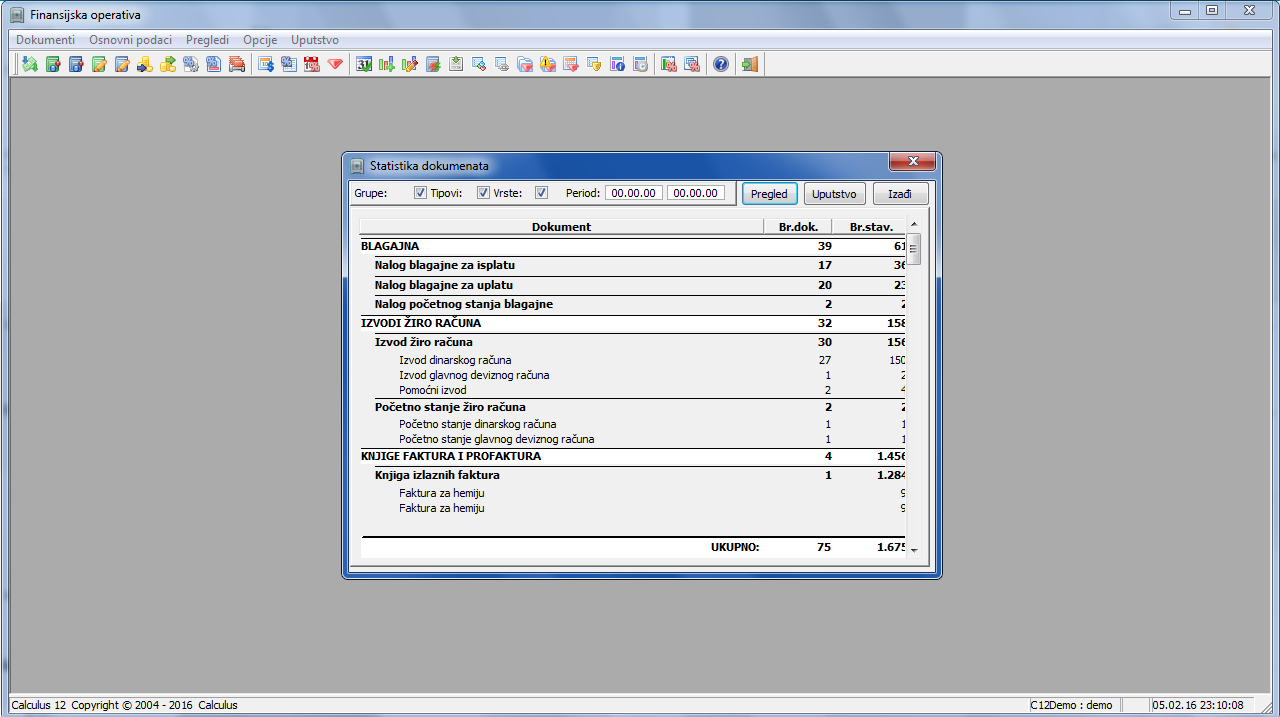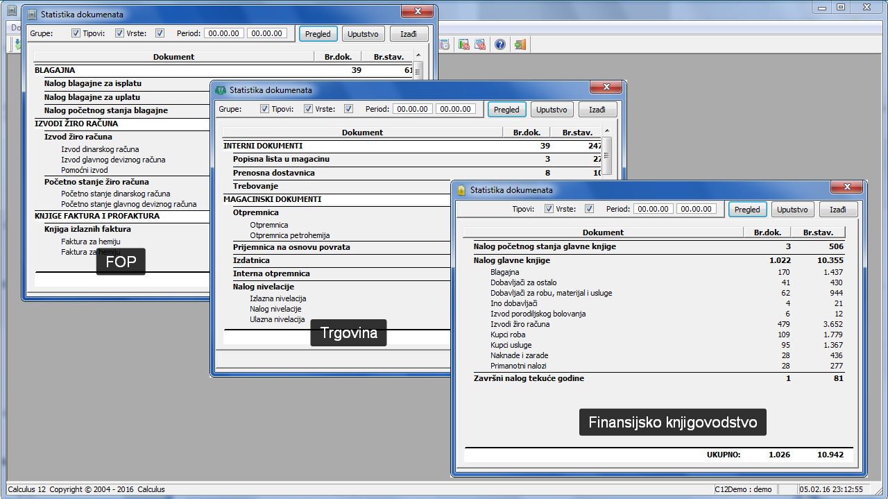 Statistika dokumenata u programima FOP, Trgovina i Glavna knjiga..