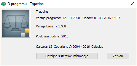 . Prozor "O programu" sadrži naziv programa u kojem ste otvorili ovaj prozor, tekuću verziju Calculusa 12, datum poslednjih instaliranih dodataka, tekuću verziju baze podataka i poslovnu godinu otvorene baze podataka.