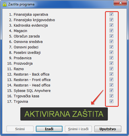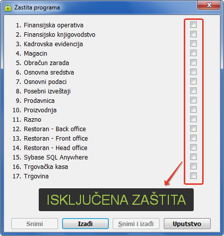 Da biste ušli u program "Zaštita", morate se prijaviti određenoj bazi podataka za koju želite da podesite zaštitu i imati administratorska prava pristupa i lozinku. U prozoru su prikazani svi korisnički programi paketa. Uz svaki od njih možete uključiti ili isključiti polje za potvrdu, čime uključujete, odnosno isključujete zaštitu za pojedini program (vidi sliku)